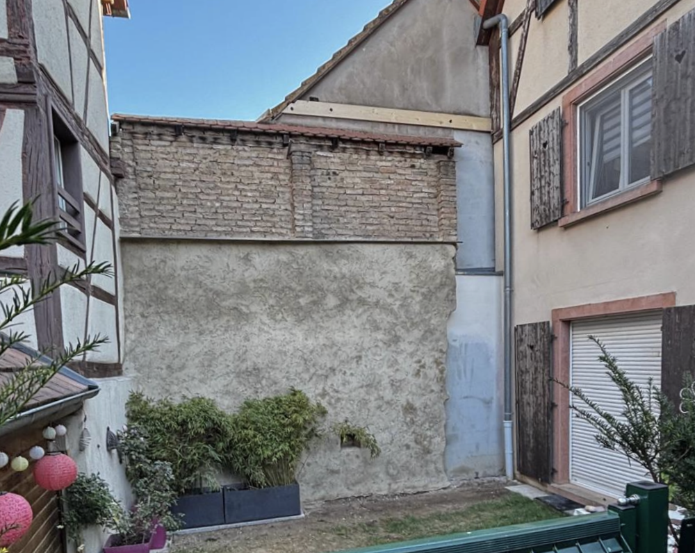 Ouverture et nettoyage des joints, reprise de la maçonnerie, pose d’un treillis renforcé et application d’un crépi traditionnel — pour un mur solide, durable et esthétique.